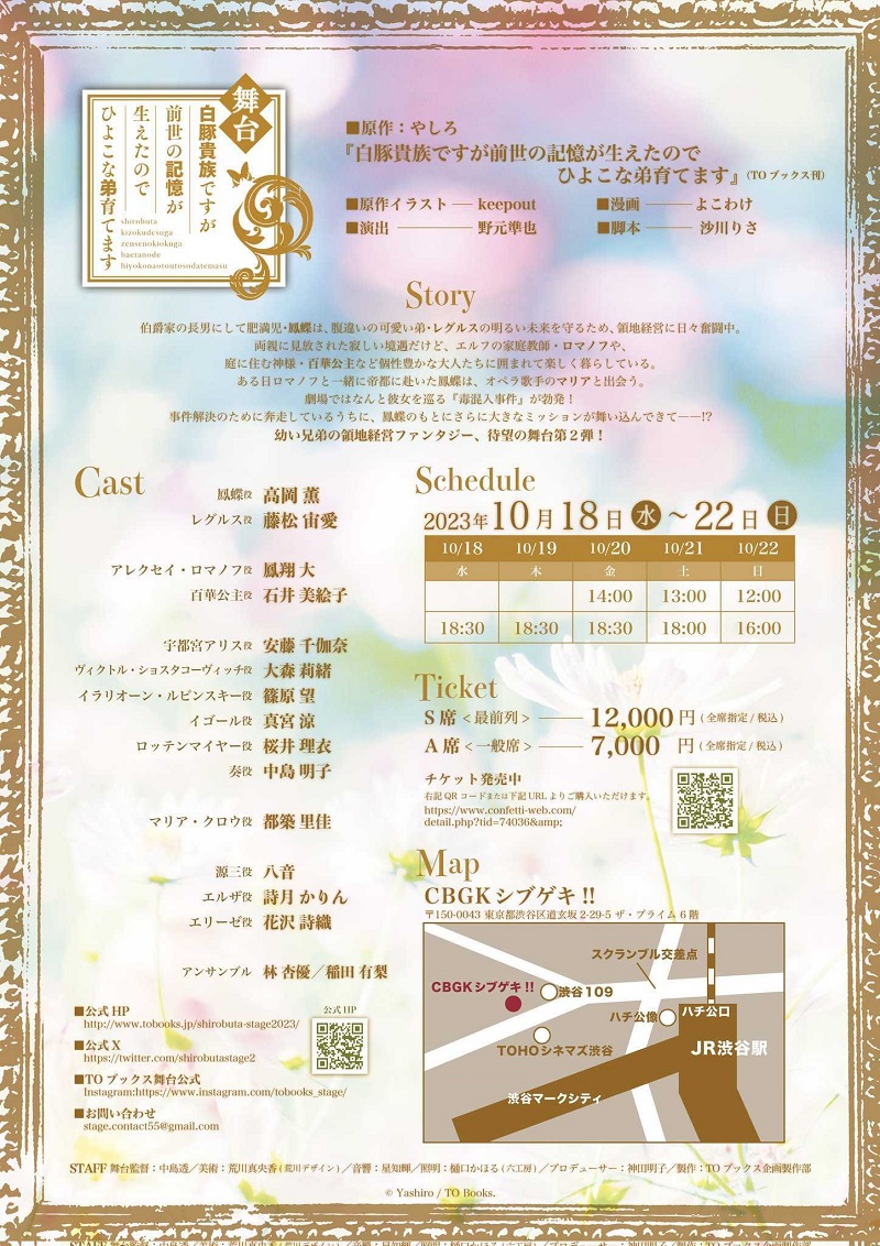 株式会社TOブックス(東京都渋谷区)製作、舞台『白豚貴族ですが前世の記憶が生えたのでひよこな弟育てます』が2023年10月18日 (水) ~2023年10月22日 (日)にCBGKシブゲキ!!(東京都渋谷区道玄坂 2-29-5ザ・プライム 6階)にて上演されます。